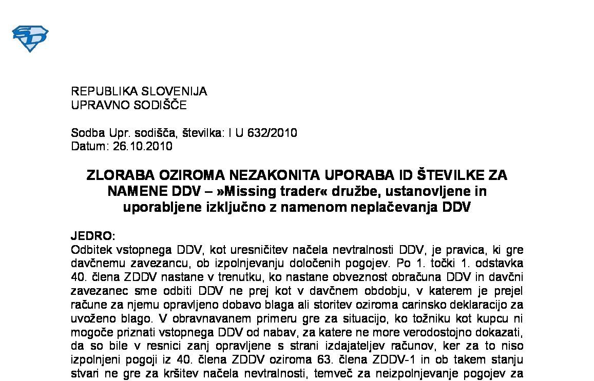 IZPOLNJEVANJE POGOJEV ZA DOBAVO BLAGA ZNOTRAJ UNIJE, OPROŠČENO PLAČILA DDV NA PODLAGI 46. ČLENA ZDDV-1 – Nepopolne CMR listine (I U 1704/2021-38) 27.11.2024 15.10.2025