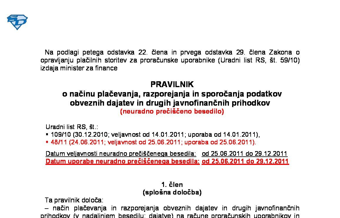 | Pravilnik o plačevanju in razporejanju obveznih dajatev in drugih javnofinančnih prihodkov (NUPB - neuradno prečiščeno besedilo) | 10.02.2024 | 02.02.2024 | ||