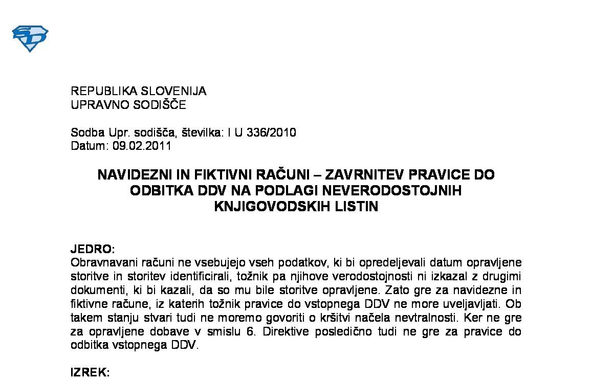 IZPOLNJEVANJE POGOJEV ZA DOBAVO BLAGA ZNOTRAJ UNIJE, OPROŠČENO PLAČILA DDV NA PODLAGI 46. ČLENA ZDDV-1 – Nepopolne CMR listine (I U 1704/2021-38) 27.11.2024 15.10.2025