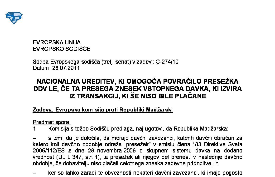 VRAČILO DDV DAVČNIM ZAVEZANCEM, KI NIMAJO SEDEŽA V DRŽAVI ČLANICI VRAČILA – GLAVNA IN POMOŽNA STORITEV – UMETNA DELITEV ENOTNE STORITVE – Neobstoj premestitve predmeta dobave (C-234/24) 23.10.2025 24.10.2025