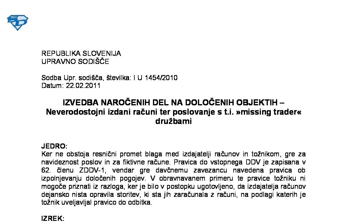 IZPOLNJEVANJE POGOJEV ZA DOBAVO BLAGA ZNOTRAJ UNIJE, OPROŠČENO PLAČILA DDV NA PODLAGI 46. ČLENA ZDDV-1 – Nepopolne CMR listine (I U 1704/2021-38) 27.11.2024 15.10.2025