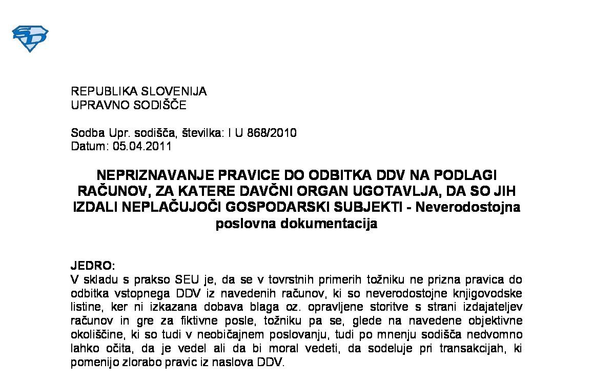 IZPOLNJEVANJE POGOJEV ZA DOBAVO BLAGA ZNOTRAJ UNIJE, OPROŠČENO PLAČILA DDV NA PODLAGI 46. ČLENA ZDDV-1 – Nepopolne CMR listine (I U 1704/2021-38) 27.11.2024 15.10.2025