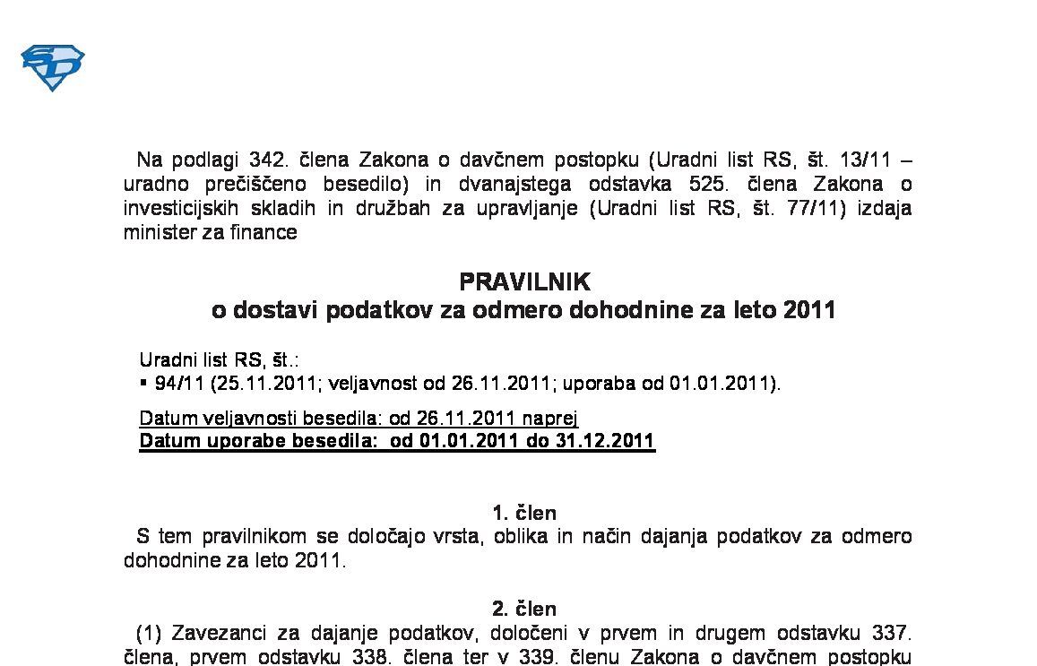 Čeprav je datum veljavnosti Pravilnika od 26.11.2011 naprej, se Pravilnik iz vsebinskega zornega kota uporablja za obdobje od 01.01.2011 do 31.12.2011. Priloga - Oblika in način dostave podatkov.pdf