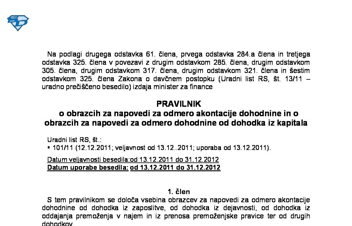 Pravilnik o obrazcih za napovedi za odmero akontacije dohodnine ter obrazcih za napovedi za odmero dohodnine od dohodka iz kapitala in dohodka iz oddajanja premoženja v najem (NUPB - neuradno prečiščeno besedilo) 20.12.2025 [!] 23.12.2025