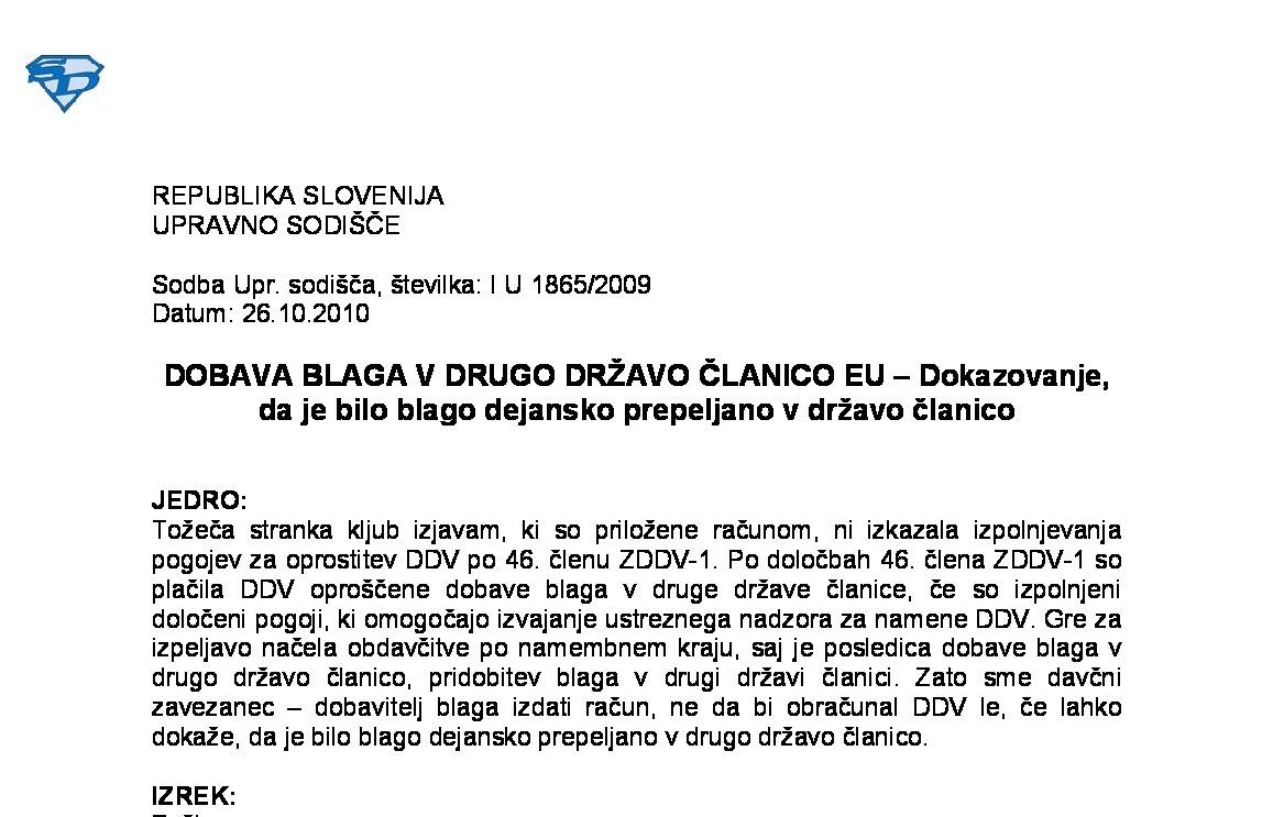 IZPOLNJEVANJE POGOJEV ZA DOBAVO BLAGA ZNOTRAJ UNIJE, OPROŠČENO PLAČILA DDV NA PODLAGI 46. ČLENA ZDDV-1 – Nepopolne CMR listine (I U 1704/2021-38) 27.11.2024 15.10.2025