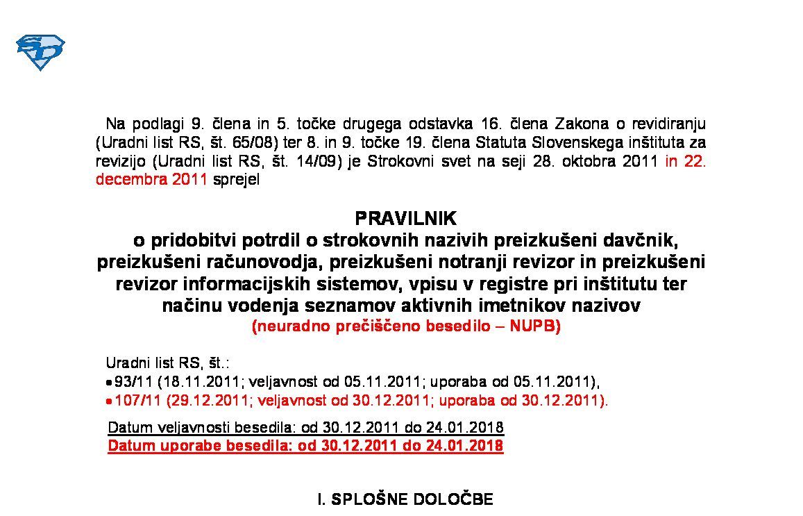 Pravilnik o pogojih za pridobitev potrdila o strokovnih znanjih za opravljanje nalog pooblaščenega revizorja, potrdila o strokovnih znanjih za opravljanje nalog dajanja zagotovil o trajnostnosti in obveznem praktičnem usposabljanju 22.02.2025 [!] 25.02.2025