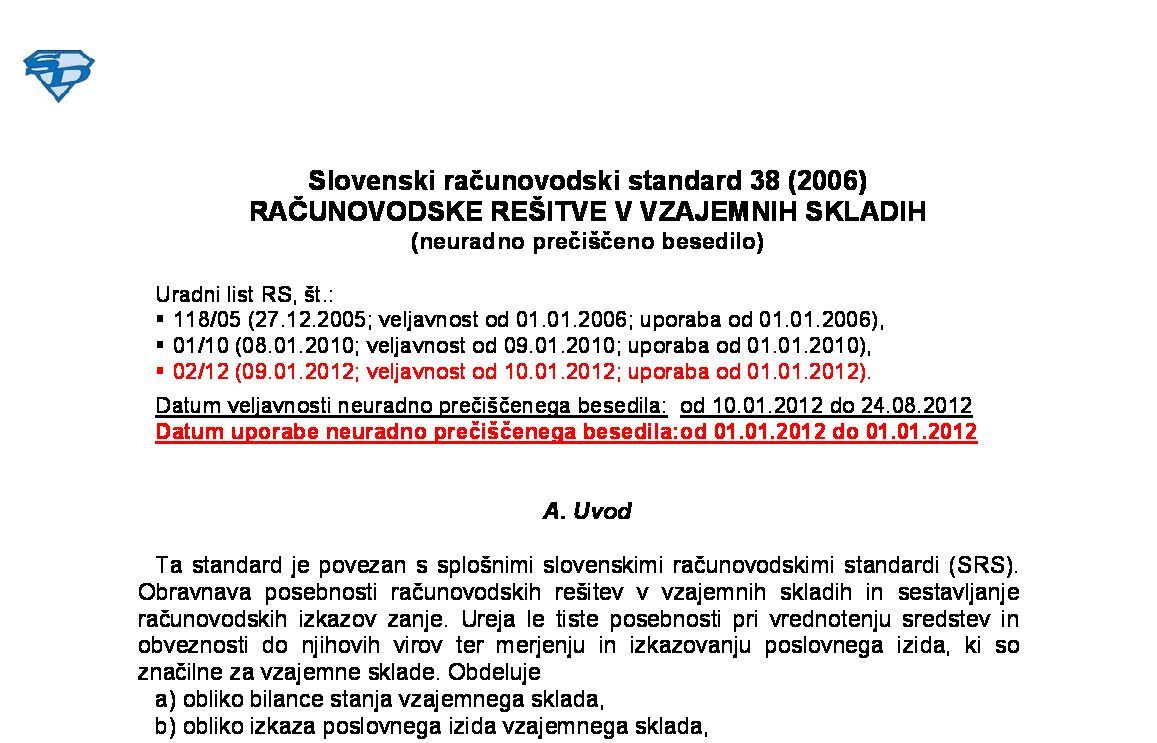 Podjetja, ki imajo poslovno leto enako koledarskemu začnejo spremenjen in popravljen standard (NUPB) uporabljati s 1. januarjem 2012, preostala podjetja pa s prvim poslovnim letom, ki se začne po tem datumu. SRS 38 (2006) je z objavo spremembe v UL RS, št. 64/12 z dne 24.08.2012 delno spremenjen. |