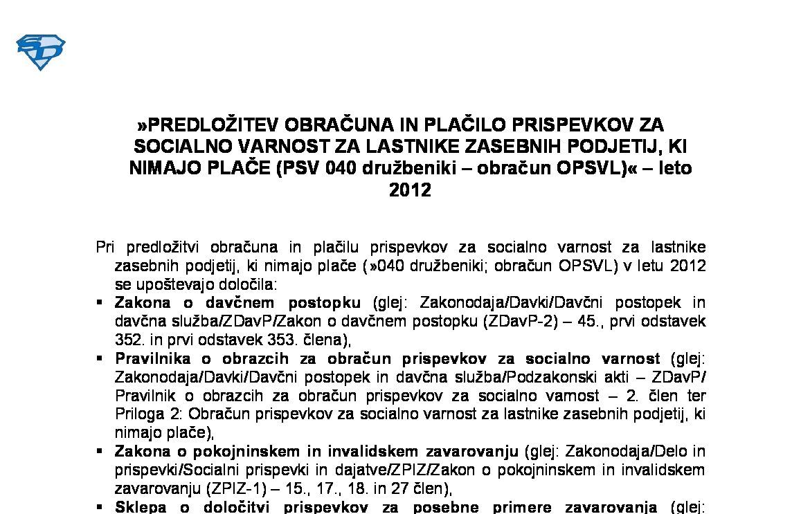 PREDLOŽITEV OBRAČUNA IN PLAČILO PRISPEVKOV ZA SOCIALNO VARNOST ZA DRUŽBENIKE/DELNIČARJE GOSPODARSKIH DRUŽB IN USTANOVITELJE ZAVODOV/ZADRUG, KI SO POSLOVODNE OSEBE IN NISO ZAVAROVANE NA DRUGI PODLAGI (PSV 040 družbeniki – obračun OPSVL) – leto 2026 13.01.2026