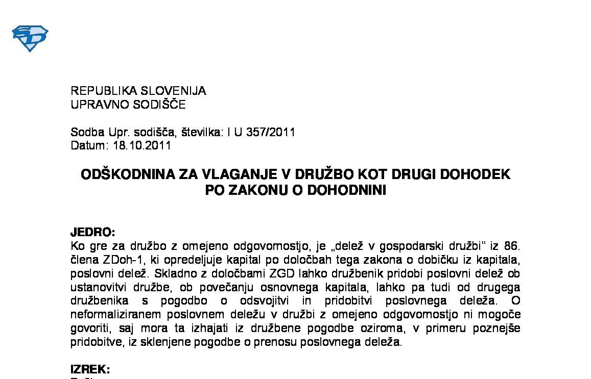 PREJEM POSLOVNEGA DELEŽA V DRUŽBI OB ANGAŽIRANJU PRI SANACIJI DRUŽBE – Darilo, ki se obdavčuje po ZDDD, ali dohodek obdavčen po ZDoh-2 (I U 1495/2022-13) 20.11.2024 10.07.2025