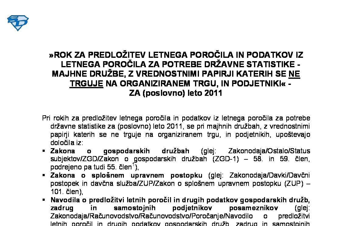 PREDLOŽITEV LETNEGA POROČILA IN PODATKOV IZ LETNEGA POROČILA ZA POTREBE DRŽAVNE STATISTIKE – MAJHNE DRUŽBE, Z VREDNOSTNIMI PAPIRJI KATERIH SE NE TRGUJE NA ORGANIZIRANEM TRGU, IN PODJETNIKI - ZA (poslovno/koledarsko) leto 2025 04.02.2026