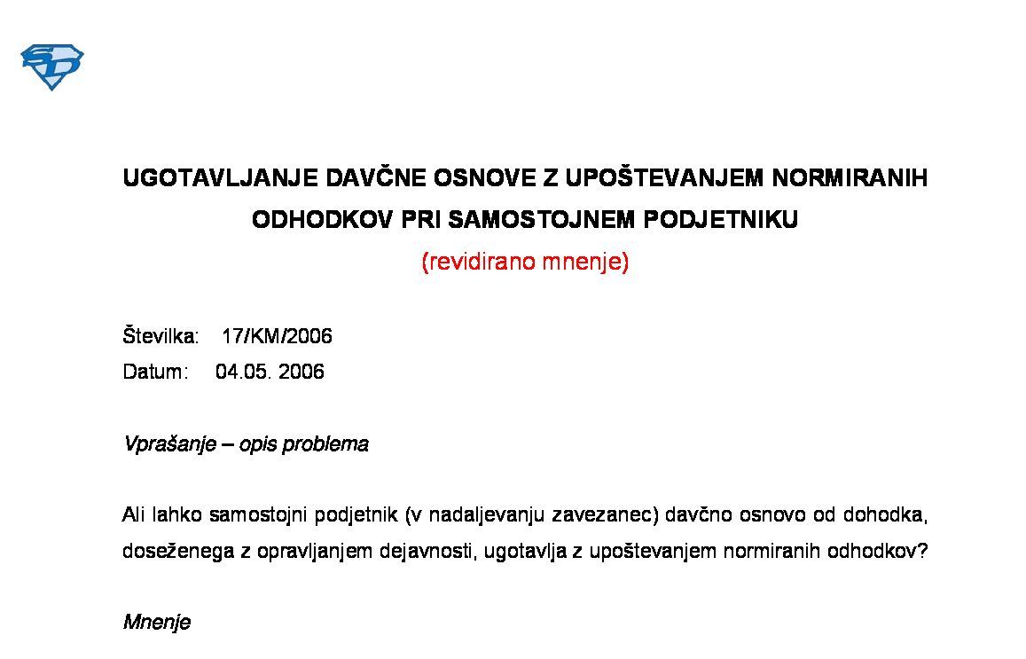 UGOTAVLJANJE DAVČNE OSNOVE OD DOHODKA IZ DEJAVNOSTI Z UPOŠTEVANJEM NORMIRANIH ODHODKOV – Obstoječe opravljanje dejavnosti in prihodkovni limit za normiranost 20.01.2026 20.01.2026