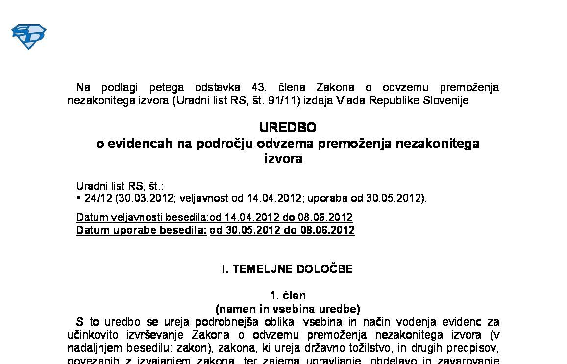 Uredba o evidencah na področju odvzema premoženja nezakonitega izvora (neuradno prečiščeno besedilo) 09.06.2012 15.06.2012