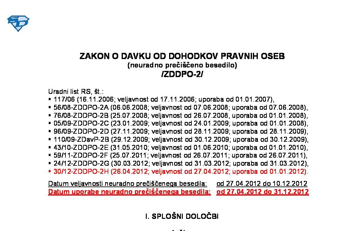 ZAKON O DAVKU OD DOHODKOV PRAVNIH OSEB (ZDDPO-2 - neuradno prečiščeno besedilo) 01.01.2026 [!] 07.11.2025