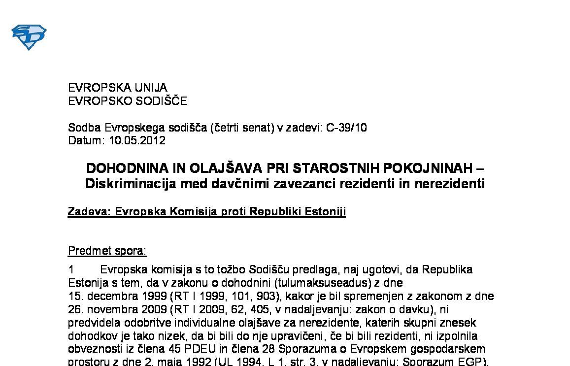 DELAVEC IZ DRŽAVE ČLANICE, KI JE PRENESEL SVOJE STALNO PREBIVALIŠČE V ŠVICO – Davčne ugodnosti – Omejitev na omejeno obdavčljive delavce, ki so rezidenti države članice ali države pogodbenice Sporazuma o EGP – Enako obravnavanje (C-627/22) 30.05.2024 31.05.2024