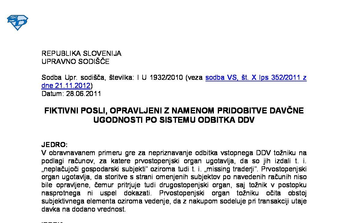 IZPOLNJEVANJE POGOJEV ZA DOBAVO BLAGA ZNOTRAJ UNIJE, OPROŠČENO PLAČILA DDV NA PODLAGI 46. ČLENA ZDDV-1 – Nepopolne CMR listine (I U 1704/2021-38) 27.11.2024 15.10.2025