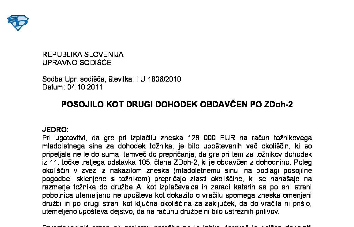 PREJEM POSLOVNEGA DELEŽA V DRUŽBI OB ANGAŽIRANJU PRI SANACIJI DRUŽBE – Darilo, ki se obdavčuje po ZDDD, ali dohodek obdavčen po ZDoh-2 (I U 1495/2022-13) 20.11.2024 10.07.2025