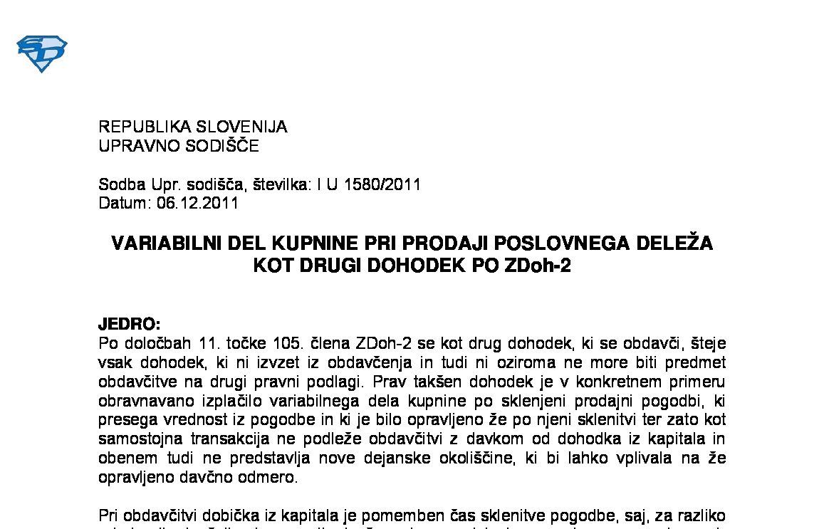 PREJEM POSLOVNEGA DELEŽA V DRUŽBI OB ANGAŽIRANJU PRI SANACIJI DRUŽBE – Darilo, ki se obdavčuje po ZDDD, ali dohodek obdavčen po ZDoh-2 (I U 1495/2022-13) 20.11.2024 10.07.2025
