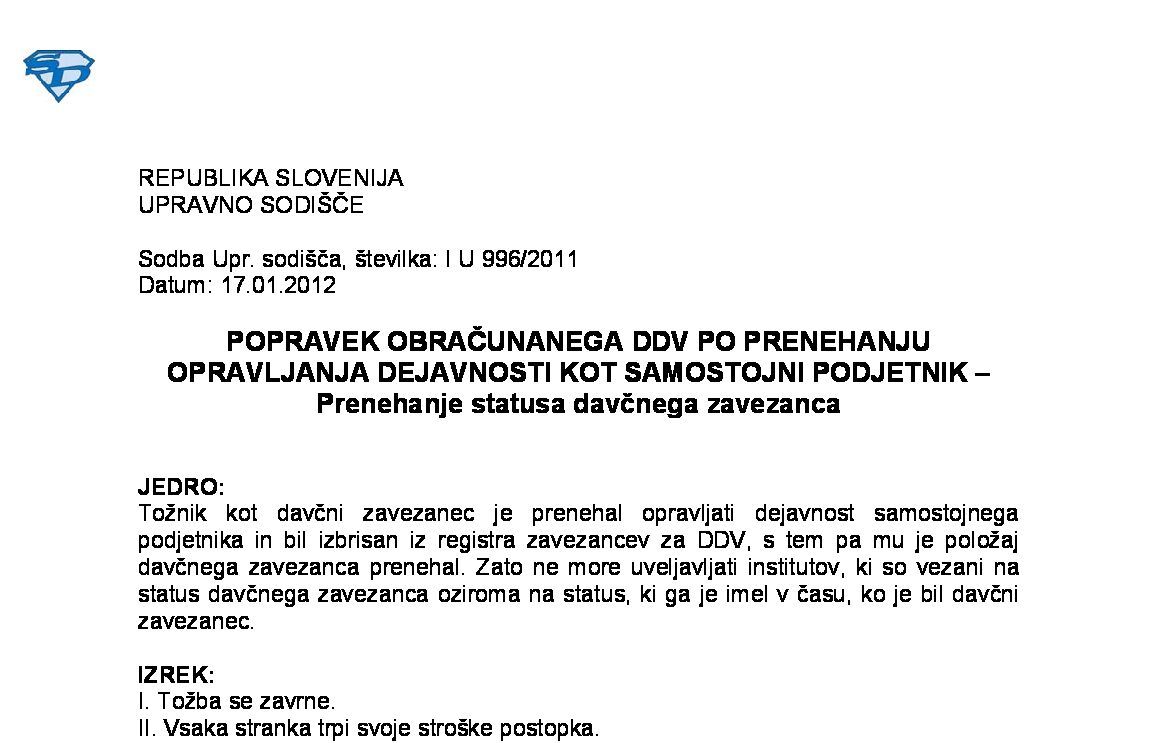 IZPOLNJEVANJE POGOJEV ZA DOBAVO BLAGA ZNOTRAJ UNIJE, OPROŠČENO PLAČILA DDV NA PODLAGI 46. ČLENA ZDDV-1 – Nepopolne CMR listine (I U 1704/2021-38) 27.11.2024 15.10.2025