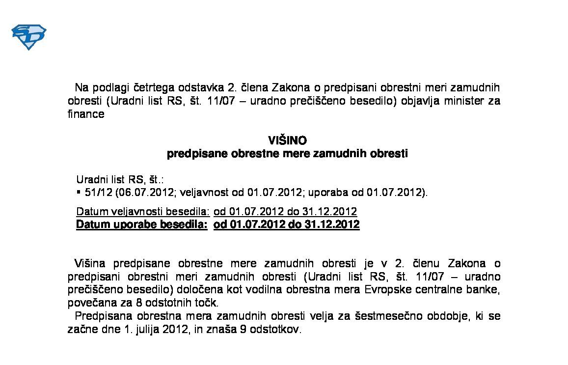 Predpisana obrestna mera, skladno z drugim odstavkom 2. člena ZPOMZO-1, velja za šestmesečno obdobje, ki se začne s 1. januarjem oziroma 1. julijem. Članek nima prilog!