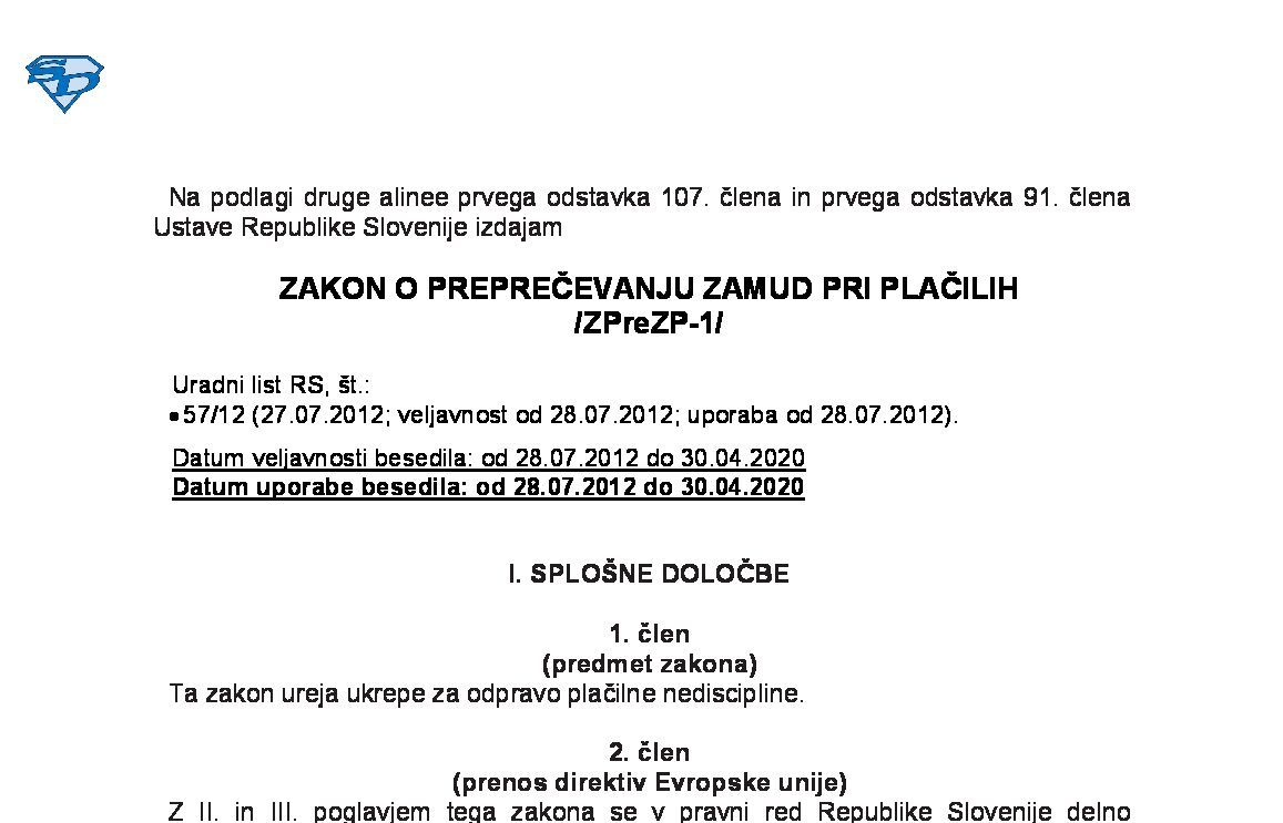 ZAKON O PREPREČEVANJU ZAMUD PRI PLAČILIH (ZPreZP-1 - neuradno prečiščeno besedilo) 08.11.2022 [!] 14.11.2022