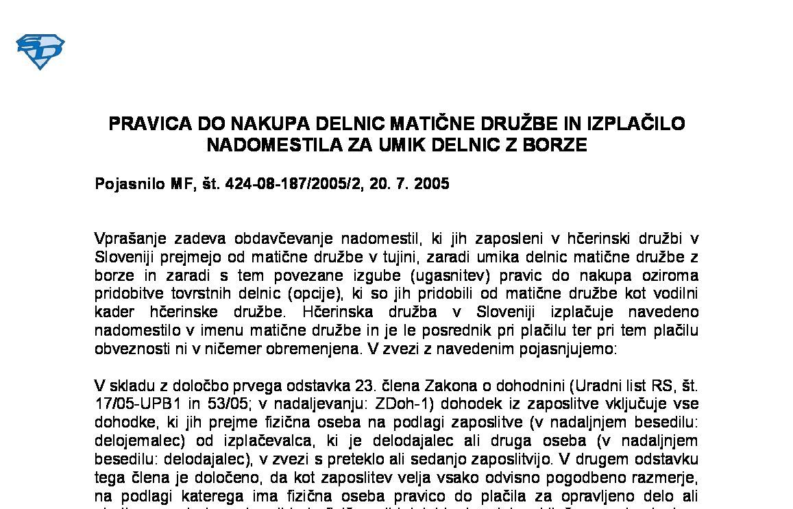 Pojasnilo je datirano/izdano na 20.07.2005 in je izdano skladno s takrat veljavnimi določbami ZDoh-1. V tej spletni podatkovni bazi ga z zamikom objavljamo, ker je lahko stališče MF uporaben pripomoček tudi pri dohodninskih posledicah dohodka skladno z zdaj veljavnim ZDoh-2.