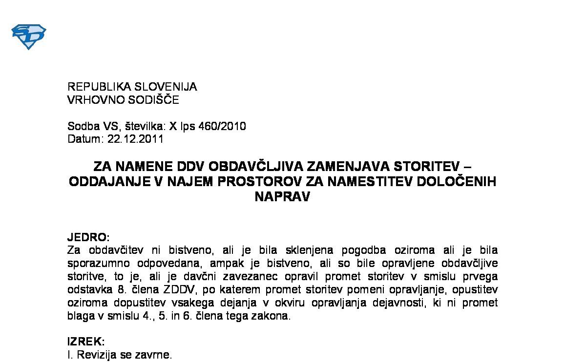 ODVETNIŠKA DEJAVNOST – Brezplačno zastopanje strank v postopkih pred sodišči – Obdavčitev prejetih povračil stroškov postopka (X Ips 8/2017) 13.09.2023 14.02.2024
