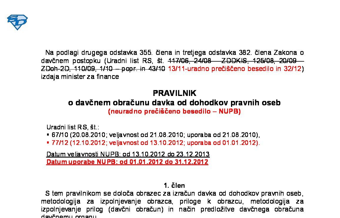 Pravilnik se uporablja za obračun DDPO, ki vključuje obdobje od 1. januarja 2012 dalje in se davčni obračun predlaga po dnevu uveljavitve sprememb pravilnika (tj. od 13.10.2012 naprej) ter najkasneje do vključno predložitve obračuna z dne 23.12.2013. Priloga 1 - Obrazec DDPO.pdf