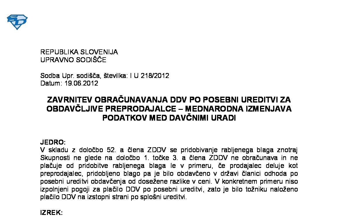 IZPOLNJEVANJE POGOJEV ZA DOBAVO BLAGA ZNOTRAJ UNIJE, OPROŠČENO PLAČILA DDV NA PODLAGI 46. ČLENA ZDDV-1 – Nepopolne CMR listine (I U 1704/2021-38) 27.11.2024 15.10.2025