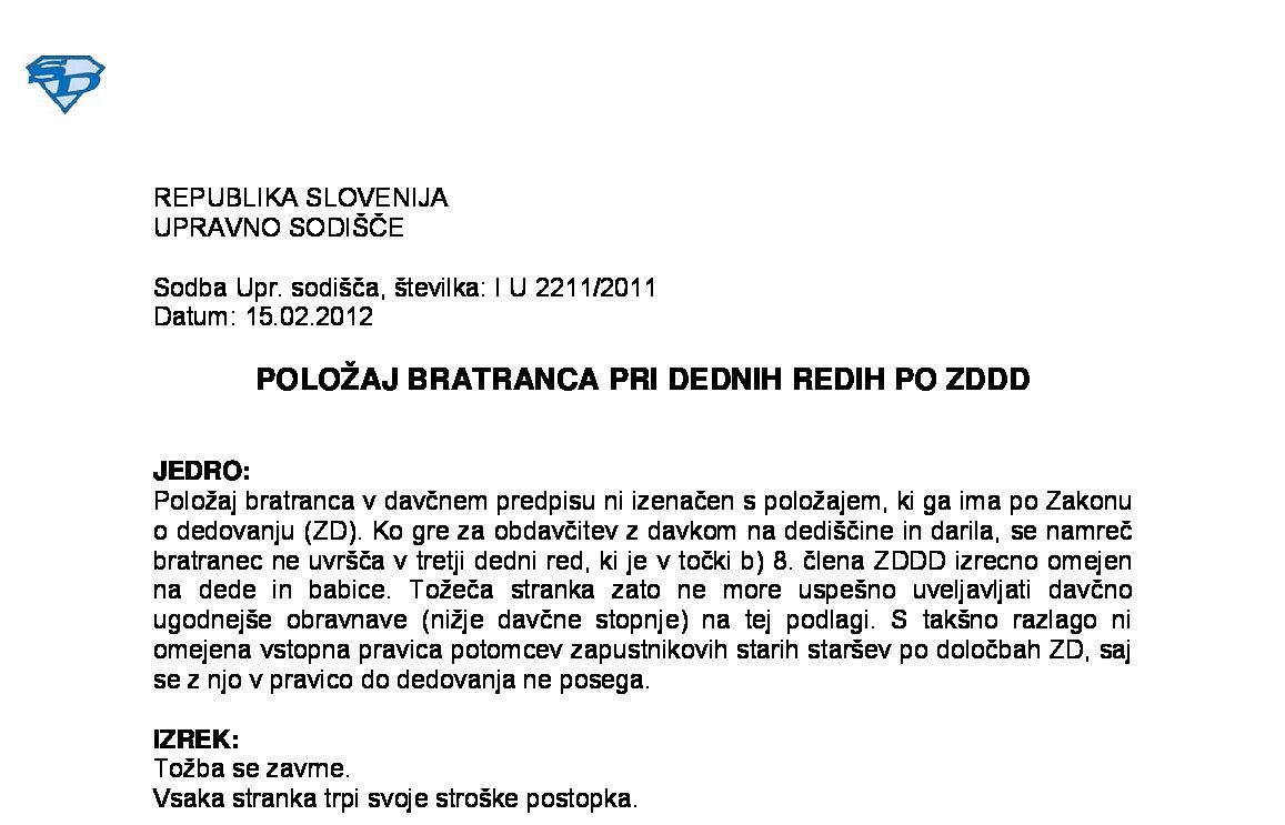 PREJEM POSLOVNEGA DELEŽA V DRUŽBI OB ANGAŽIRANJU PRI SANACIJI DRUŽBE – Darilo, ki se obdavčuje po ZDDD, ali dohodek obdavčen po ZDoh-2 (I U 1495/2022-13) 20.11.2024 10.07.2025