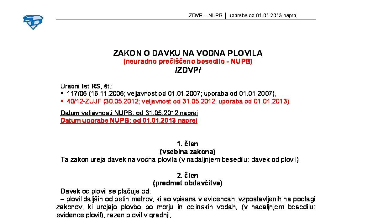 ZAKON O DAVKU NA VODNA PLOVILA (ZDVP) 01.01.2007 [!] 31.12.2012 20.11.2006