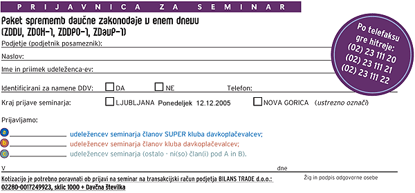 | • možnost izbire obračunavanja DDV po plačani ali fakturirani realizaciji; • izpolnjevanje pogojev za obračunavanje DDV po sistemu plačane realizacije; • dodatna davčna administracija pri obračunavanju DDV po sistemu plačane realizacije; • kdaj vstopiti v sistem obračunavanja DDV na osnovi plačane realizacije (časovni in finančno-optimizacijski vidik); • druge spremembe ZDDV in odgovori na vprašanja. | • dodatni oproščeni dohodki; • katere bonitete ostajajo obdavčljive (uporaba telekomunikacijske opreme, parkirnih prostorov, službenih osebnih vozil...); • ugodnejša obdavčitev obresti, dividend in dobička iz kapitala; • druge spremembe ZDOH-1 in odgovori na vprašanja; • znižanje davka na izplačane plače. | • novosti pri izvzemaju prihodkov davčnih zavezancev iz davčne osnove (odprava dvojne obdavčitve določenih dohodkov); • pomembne spremembe pri izkazovanju stroškov amortizaije v povezavi z davčno priznanimi odhodki; • novosti pri spremembi davčnega obdobja; • ureditev davčne obravnave nastalih razlik zaradi spremenjenih pravil računovodenja (v povezavi z MSRP itd); • nova davčna olajšava za spodbujanje raziskav in razvoja ter odgovori na vprašanja. | • skrajšanje roka za zastaranje davčnih obveznosti; • spremembe in opredelitve rokov v davčnem postopku (najava davčnega organa pred inšpiciranjem, oddaja pripomb na zapisnik, zaseg dokumentacije...); • nekateri davčni podatki več ne bodo tajni; • samoprijava davčnega zavezanca - dobre strani in skrite pasti; • ostale spremembe (ukinitev ODO-2 obrazca itd.). |