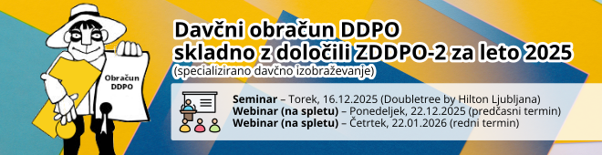 | | PRIPOROČILO ZA UDELEŽBO Webinar je glede na obravnavano problematiko namenjen širšemu krogu slušateljev: računovodjem, pravnikom, revizorjem, davčnim svetovalcem, komercialistom, direktorjem, informatikom ter drugim odgovornim osebam za računovodsko in davčno področje pri davčnih zavezancih. BESEDA O PREDAVATELJICI Mira Roppa, spec.davč.svet., je samostojna davčna svetovalka družbe Aliter d.o.o. Na področju davčnega svetovanja deluje že več kot dvajset let. Ima zaključen podiplomski študij in s tem pridobljen naziv specialistke davčnega svetovanja (EPF v Mariboru), fakultetna izobrazba univerzitetno diplomirana ekonomistka, specialistka za davek od dohodkov pravnih oseb, preventivnih davčnih pregledov, optimizacijo poslovnih učinkov podjetij z davčnega vidika, dohodnine in računovodstva ter nastopa kot pooblaščenka v davčnih postopkih. Je avtorica številnih člankov in soavtorica knjige z davčnega področja ter uveljavljena predavateljica na davčnih seminarjih. Kot predavateljica je sodelovala na že več kot 250 seminarjih, konferencah, davčnih šolah … DATUM IN ČAS IZVEDBE • Seminar (v živo) – Torek, 16.12.2025 (Dunajska cesta 154, Double Tree By Hilton Ljubljana - bivši Austria Trend Hotel)