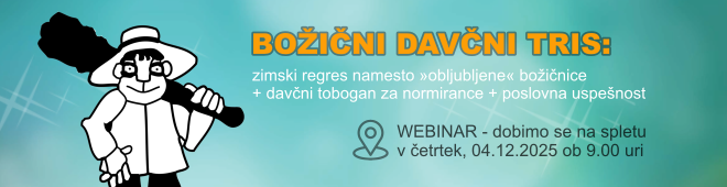 Iz PRAKSE za PRAKTIČNE uporabnike V BOŽIČNEM DAVČNEM TRISU bomo razvozlali davčni tobogan normirancev, razčistili nove obveznosti delodajalcev glede zimskega regresa ter ponovili – skladno z aktualno prakso – in novimi spremembami tudi ključne poudarke pri obdavčitvi poslovne uspešnosti. NE PREZRITE – POSEBNO SPOROČILO ORGANIZATORJA IN PREDAVATELJA: Vsaka davčna reforma pri nas slej ko prej postane davčna parodija — in tudi tokrat ni nič drugače. Na valu davčnega populizma znova »odkrivamo toplo vodo« pri normirancih, medtem ko se napovedana božičnica uradno preimenuje v »zimski regres«. Zimski regres bi naj bil izplačan že v decembru 2025, normiranci pa se deloma vračajo na stara pota slave januarja 2026. Spremembe segajo tako v določbe ZDoh-2 kot tudi v prispevkovno zakonodajo. | | KLIKNITE ZA HITER DOSTOP |