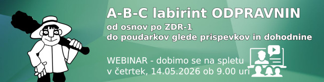 KOTIZACIJA, PRIJAVE IN VPLAČILA Kotizacijo je potrebno vplačati najkasneje do 12.05.2026, da vam lahko pravočasno posredujemo gradivo in povezavo na webinar na vaš elektronski naslov. 22% DDV je zajet v navedeno ceno - BRUTO CENA Ekskluzivna pomladna akcija - VEČ znanja za MANJ stroškov Več udeležencev = eden gratis + najugodnejša cena za vse PRIMER št. 1: - 3 udeleženci (1 × DELUX članstvo, 2 × brez članstva) - plačilo 2 × 122,00 EUR = 244,00 EUR - 1 udeleženec GRATIS prihranek: 244,00 EUR PRIMER št. 2: - 4 udeleženci (1 × SUPER članstvo, 3 × brez članstva) - plačilo 3 × 134,20 EUR = 402,60 EUR - 1 udeleženec GRATIS prihranek: 280,60 EUR Plačilo kotizacije izvedete na transakcijski račun družbe DAVČNA HIŠA BILANS d.o.o., Ulica heroja Bračiča 6, 2000 MARIBOR, številka: • NLB d.d. - SI56 0228 0009 1114 744 ter sklic: 1000 + (vaša) davčna številka (družbe ali podjetnika posameznika) S prijavo na webinar in/ali vplačilom kotizacije za webinar soglašate, da po izvedenem webinarju prejmete račun za opravljeno storitev v elektronski obliki (PDF priloga, HTML zapis) na vaš elektronski naslov. Prijavo lahko izvedete: Več informacij: (02) 23 111 10 ali [email protected] POMEMBNO - VAŠI TEHNIČNI PRIPOMOČKI ZA IZVEDBO WEBINARJA Izvedbo webinarja lahko spremljate na osebnem računalniku, prenosnem računalniku, pametni tabli, tablici, telefonu ali televiziji - z možnostjo povezave na splet. Za spremljanje webinarja ne potrebujete kamere! 2 dni pred izvedbo webinarja vam bomo posredovali: - na vaš elektronski naslov povezavo za ogled webinarja s kratkimi in jasnimi navodili ter možnostjo preizkusa vašega tehničnega pripomočka;
