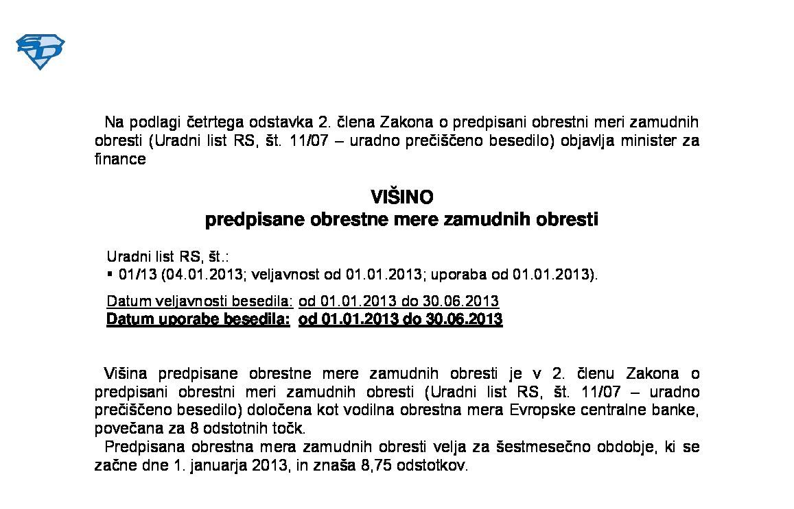 Višina predpisane obrestne mere zamudnih obresti (od 01.01. do 30.06.2025) 01.01.2025 [!] 30.06.2025 13.01.2025