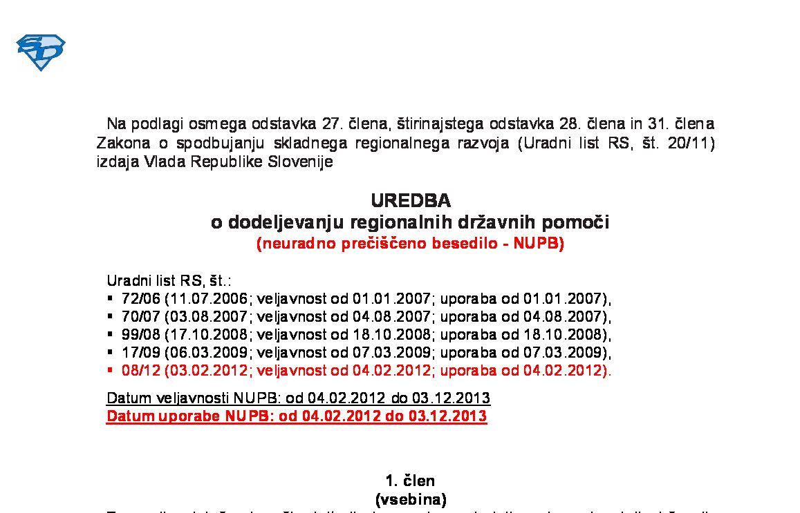 | Uredba o dodeljevanju regionalnih državnih pomoči ter načinu uveljavljanja regionalne spodbude za zaposlovanje ter davčnih olajšav za zaposlovanje in investiranje (NUPB - neuradno prečiščeno besedilo) | 27.07.2024 | 30.07.2024 | ||