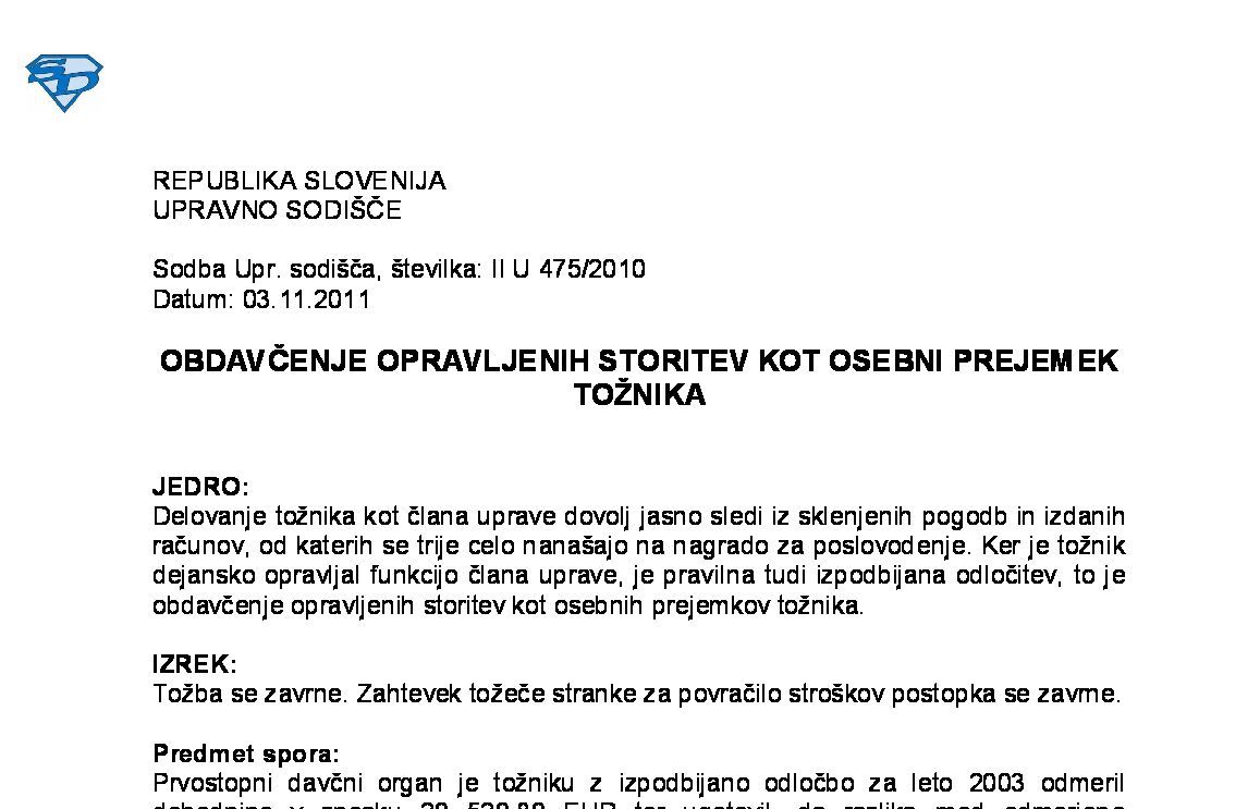 PREJEM POSLOVNEGA DELEŽA V DRUŽBI OB ANGAŽIRANJU PRI SANACIJI DRUŽBE – Darilo, ki se obdavčuje po ZDDD, ali dohodek obdavčen po ZDoh-2 (I U 1495/2022-13) 20.11.2024 10.07.2025