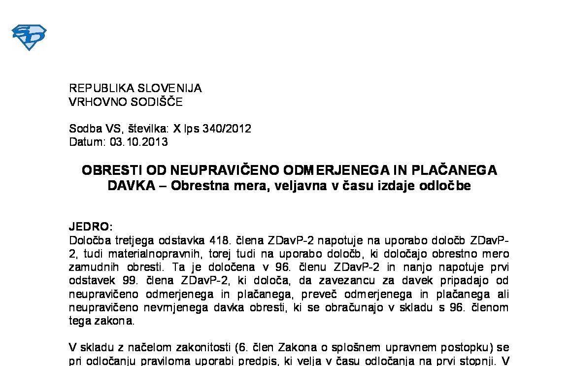 OBRAČUNAVANJE OBRESTI V POSTOPKU DAVČNEGA NADZORA (X Ips 123/2020) 28.08.2024 15.10.2024