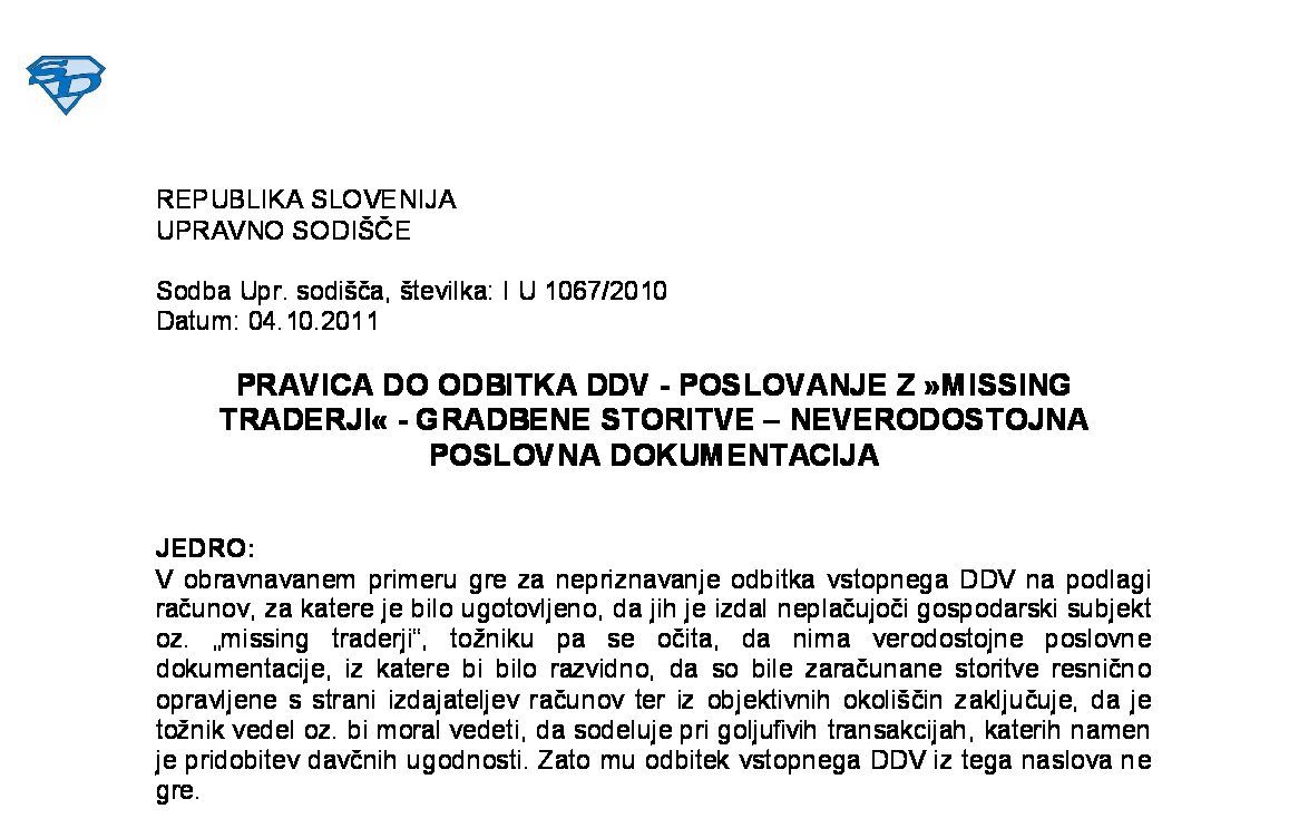 IZPOLNJEVANJE POGOJEV ZA DOBAVO BLAGA ZNOTRAJ UNIJE, OPROŠČENO PLAČILA DDV NA PODLAGI 46. ČLENA ZDDV-1 – Nepopolne CMR listine (I U 1704/2021-38) 27.11.2024 15.10.2025