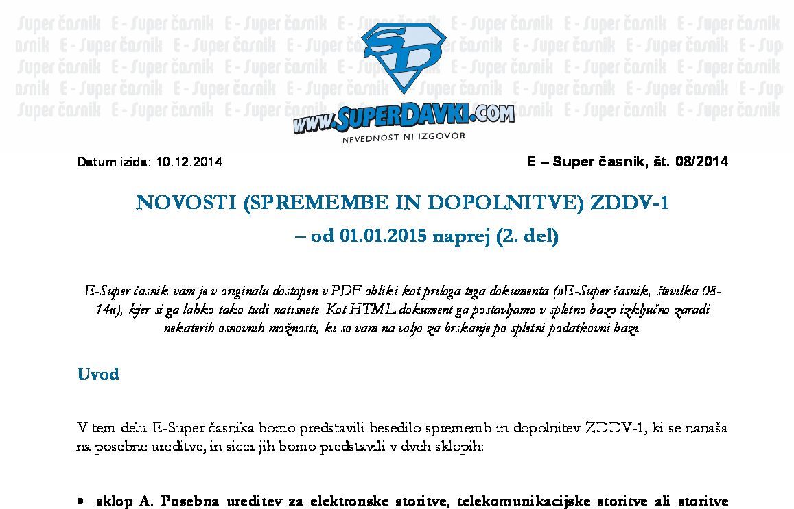 NOVOSTI (SPREMEMBE IN DOPOLNITVE) ZDDV-1 - od 01.01.2015 NAPREJ - 1. del, številka 07-14 02.12.2014