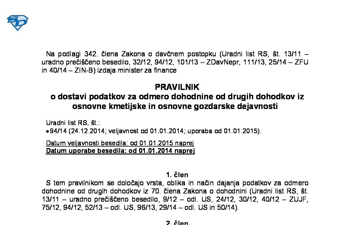 | Pravilnik o dostavi podatkov za odmero dohodnine ('dostava-obdavčljivi dohodki' - neuradno prečiščeno besedilo) | 01.01.2025 | [!] | 26.11.2025 | |
