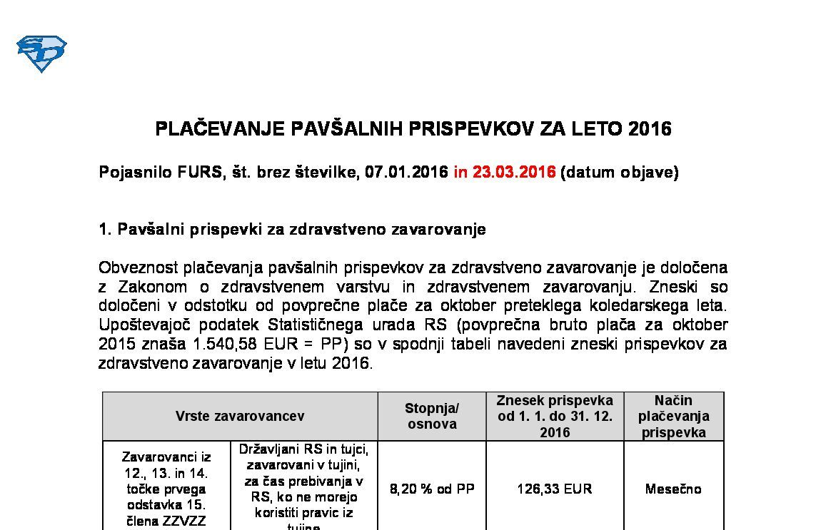 Objavljeno pojasnilo z dne 15.01.2016 dopolnjujemo - v delu novih zneskov pavšalnih prispevkov za PIZ od 01.04.2016 naprej.