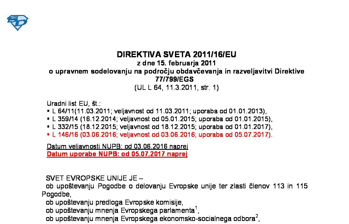 DIREKTIVA SVETA 2011/16/EU z dne 15. februarja 2011 o upravnem sodelovanju na področju obdavčevanja in razveljavitvi Direktive 77/799/EGS (neuradno prečiščeno besedilo) 01.01.2017 04.07.2017 03.02.2016
