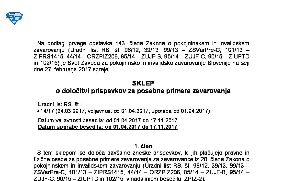 | Sklep o določitvi prispevkov za posebne primere zavarovanja (NUPB - neuradno prečiščeno besedilo) | 01.04.2025 | 12.03.2025 | ||