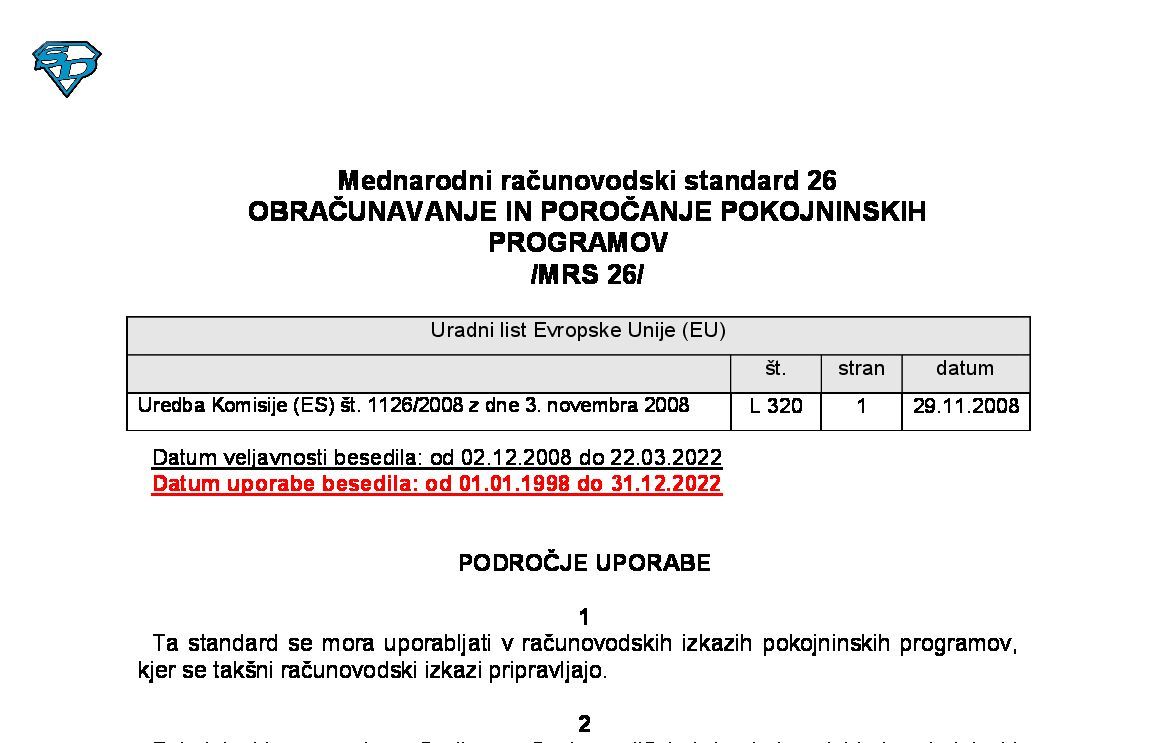 MRS-26 objavljen po Uredbi 1126/2008, ki objavlja enotno / prečiščeno besedilo standardov in nadomešča Uredbo 1725/2003, (še) ni bil noveliran.