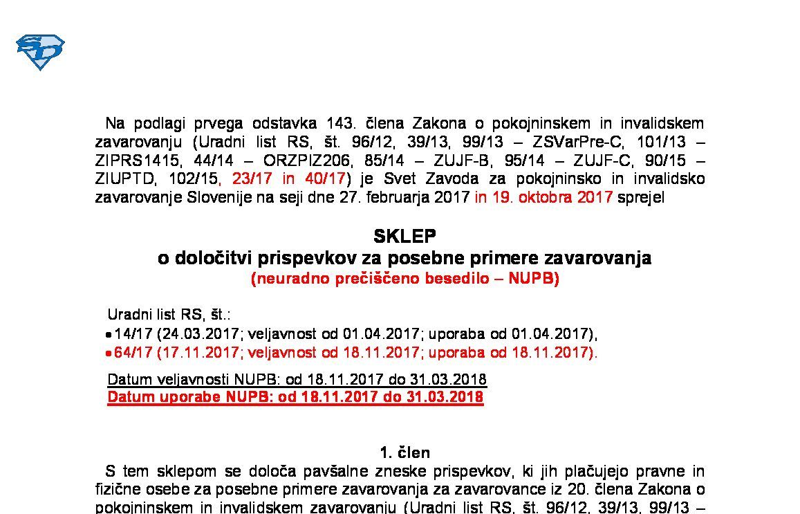 | Sklep o določitvi prispevkov za posebne primere zavarovanja (NUPB - neuradno prečiščeno besedilo) | 01.04.2025 | 12.03.2025 | ||
