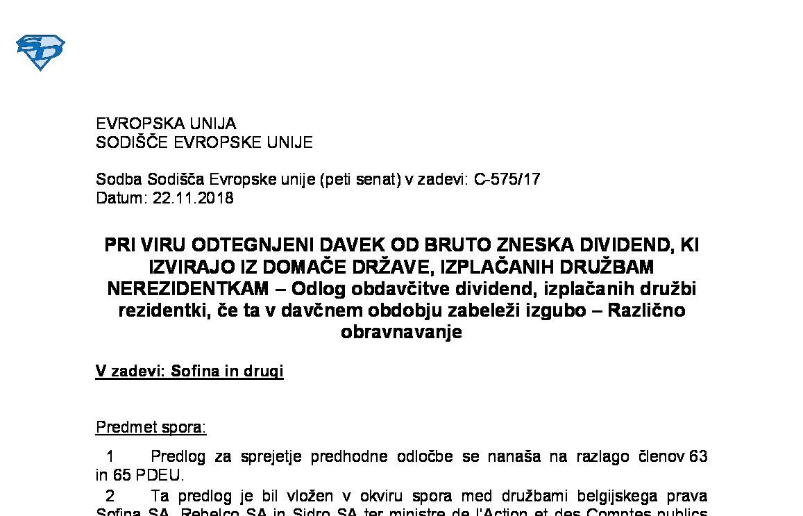 SKUPNI SISTEM OBDAVČITVE MATIČNIH DRUŽB IN ODVISNIH DRUŽB IZ RAZLIČNIH DRŽAV ČLANIC – Oprostitev DDPO od dividend, ki jih odvisna družba nerezidentka razdeli matični družbi rezidentki (C-228/24) 03.04.2025 07.04.2025