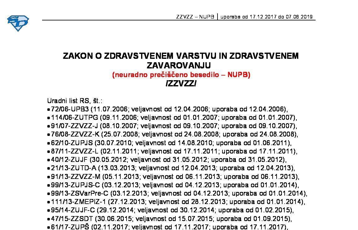 | ZAKON O ZDRAVSTVENEM VARSTVU IN ZDRAVSTVENEM ZAVAROVANJU (ZZVZZ - neuradno prečiščeno besedilo) | 08.11.2022 | [!] | 31.12.2023 | 16.11.2022 |