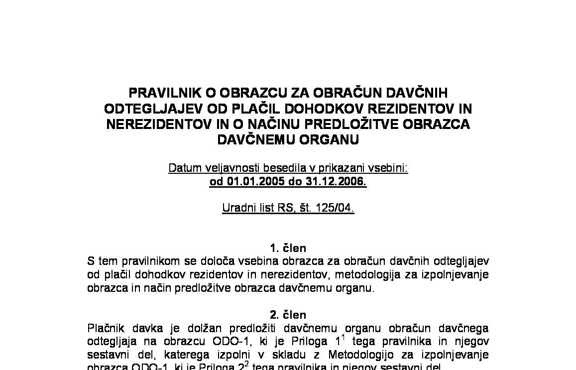 Pravilnik o obrazcu za obračun davčnih odtegljajev od plačil dohodkov rezidentov in nerezidentov in načinu predložitve obrazca davčnemu organu ("ODO-1 obrazec" - neuradno prečiščeno besedilo) 19.01.2013 21.01.2013