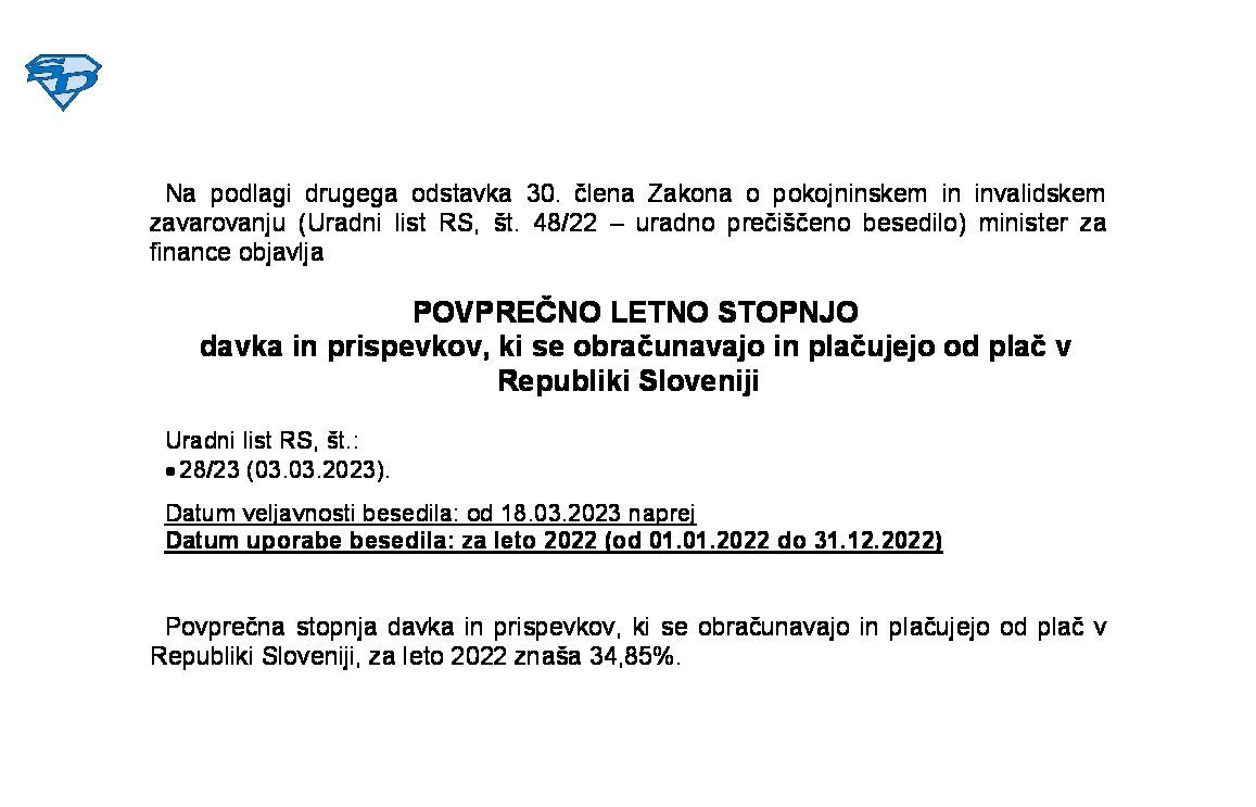 | Povprečna letna stopnja davka in prispevkov, ki se obračunavajo in plačujejo od plač v Republiki Sloveniji (leto 2023) | 01.01.2023 | 31.12.2023 | 11.03.2024 | |